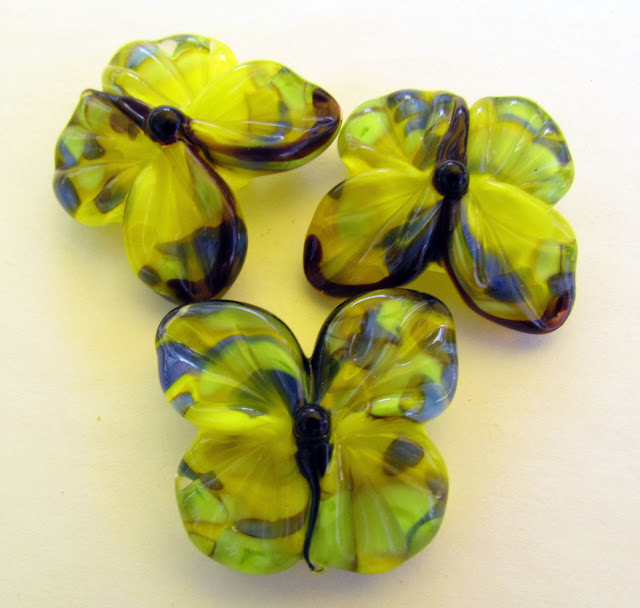 Set of 3 lampwork butterflies, made with yellow, blue and green glass.